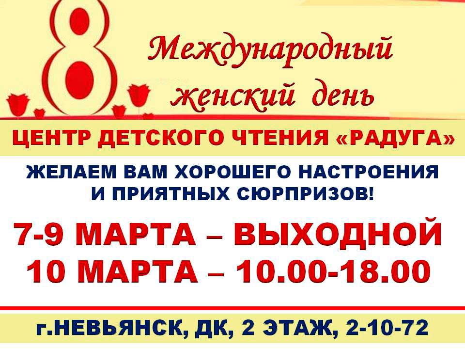 ![]() В воскресенье 1 марта в 14.00 приглашаем девчонок 11-13 лет в Центр детского чтения «Радуга» на игровую программу «Классные девчонки», посвященную 8 Марта. На встрече юные жительницы г.Невьянска примут участие в игровых и интеллектуальных конкурсах, проявят свои знани ... Читать дальше » |