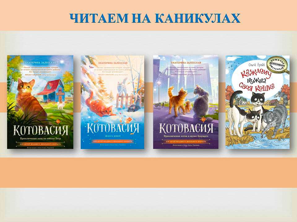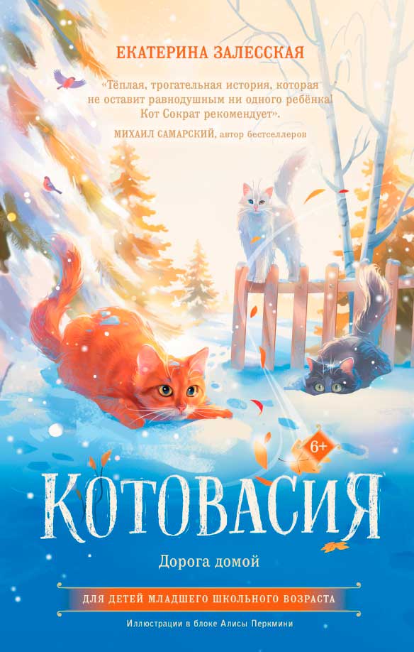 ![]() Екатерина Залесская «Котовасия. Приключения кота по имени Тигр» 6+ "Всем привет! Меня зовут Тигр, но я не тигр, а кот! Как вы понимаете, благодаря фантазии моих хозяев и, видимо, не слишком большой оригинальности я стал Тигром. Хотя окраска у меня вполне соответствующая: рыжий с кончика хвоста до кончиков ушей. Но имя своё не люблю. Как, в принципе, и хозяев. Если честно, я их почти не помню…" - так начинается эта трогательная история о коте Тигре, который живёт на даче, а вместе с ним Багет, Тюлень, Федька и другие брошенные коты. Их ждут опасные приключения: то оса ужалит, то с индюком поругаются, а то и с привидениями повстречаются. Приключения - это всегда интересно, вот только каждый кот мечтает о тёплом доме. Получится ли у них его обрести? После прочтения "Котовасии" вы не останетесь равнодушным к котикам, а ещё немного посмеётесь и над собой. Ведь нам тоже есть чему поучиться у братьев наших меньших, например умению наслаждаться жизнью, несмотря на все трудности! ![]() Екатерина Залесская «Котовасия. Приключения котов в музее будущего» 6+ В этой книге наших веселых котиков ждут незабываемые каникулы на море! Именно туда они "случайно" отправляются в хозяйских чемоданах. И, конечно, не без приключений. Коты то на самую высокую башню в мире хотят взобраться, то на воздушных шарах в парке цветов полетать. А то и вовсе раскрывают настоящее преступление – как живых котиков хотят заменить роботами! Эта история и про изменения, которые неизбежны для всех. И речь не только об инновациях и технологиях. Для кого-то эти изменения могут быть только внешними, а для кого-то внутренними и очень важными. ![]() Екатерина Залесская «Котовасия. Дорога домой» 6+ "Дорога домой" - это путь, который пройдёт каждый житель Котовасии. Кто-то обретёт свой дом в Котовасии, кто-то отправится в далёкий путь или научится жить самостоятельно, а для кого-то "дорога домой" окажется последней, но важной отправной точкой для мятежной души.