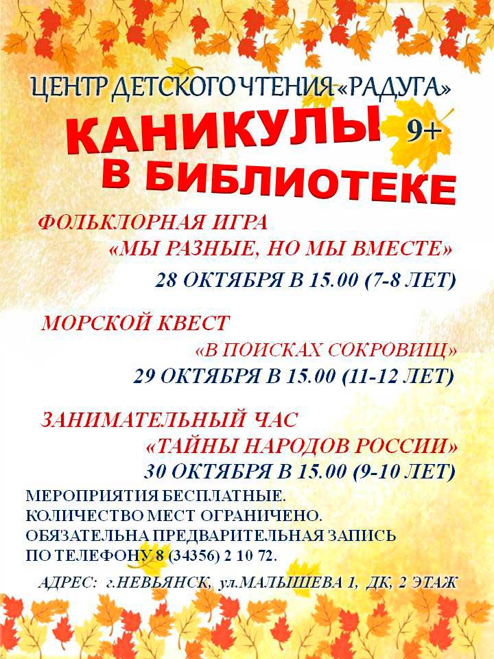 ![]() В Центре детского чтения «Радуга» в осенние каникулы пройдут интересные и познавательные мероприятия для детей в возрасте 7-12 лет. 28 октября в 15.00 (7-8 лет) состоится фольклорная игра «Мы разные, но мы вместе». Юные посетители познакомятся с национальными играми народов России и примут участие в мастерской «Расписной петушок». 29 октября в 15.00 (11-12 лет) состоится морской квест «В поисках сокровищ». Участники познакомятся с творчеством уральского писателя В.П.Крапивина, выполнят интересные задания в поисках тайника, спрятанного в библиотеке. 30 октября в 15.00 (9-10 лет) в библиотеке пройдет занимательный час «Тайны народов России». Мальчишки и девчонки примут участие в народных играх, познакомятся со сказками и песнями. Примут участие в творческой мастерской «Сердечко на удачу». Мероприятия бесплатные. Количество мест ограничено, обязательна предварительная запись по телефону 8 (34356) 2-10-72. ![]() | |