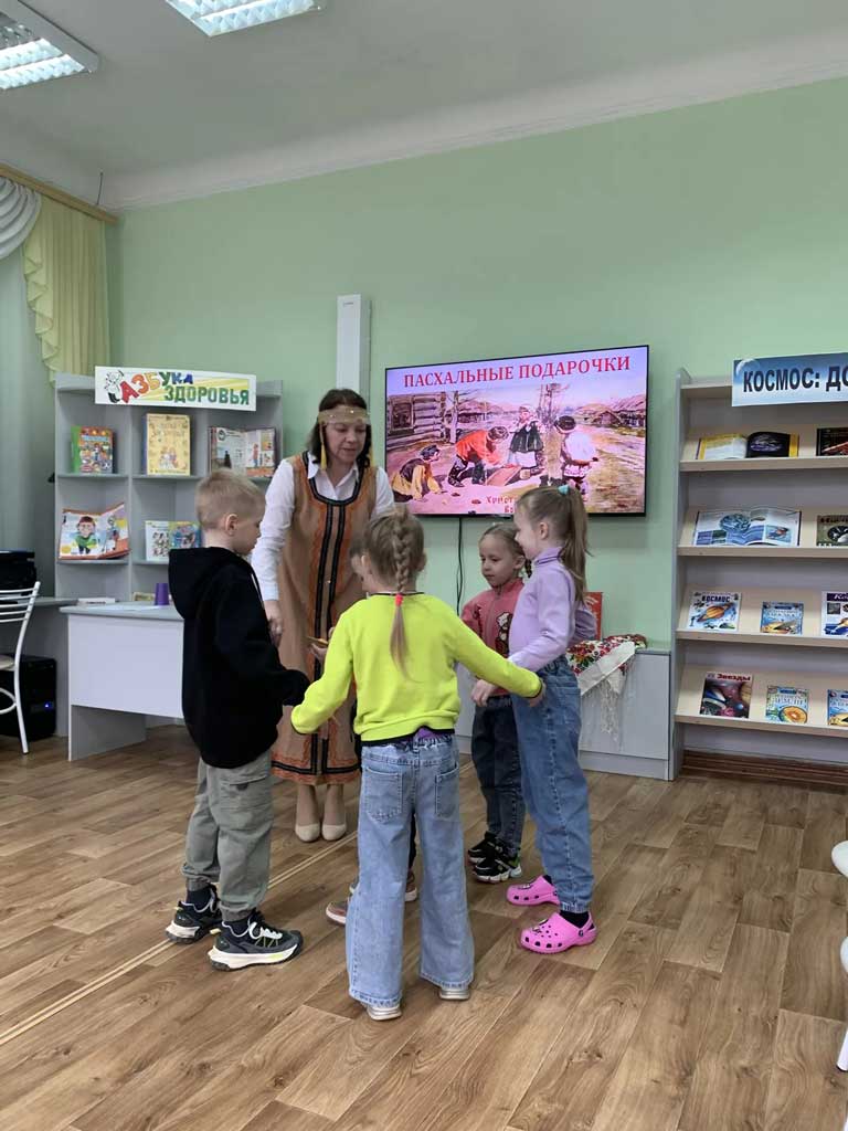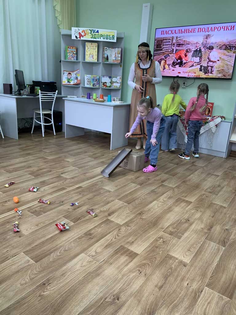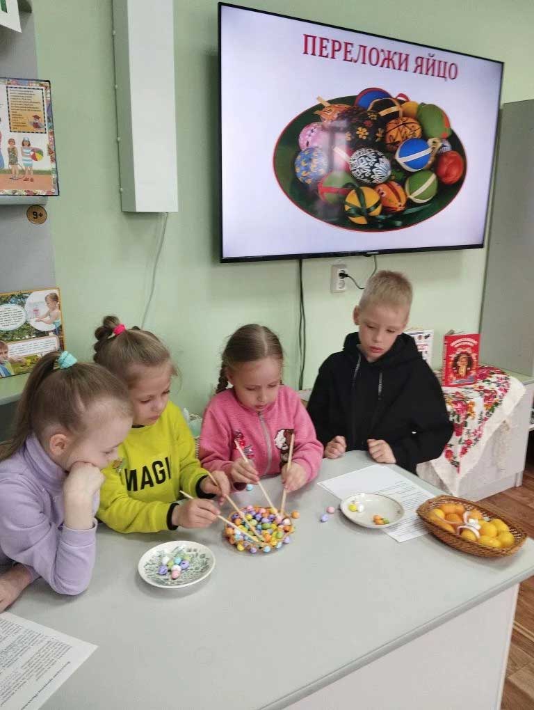 ![]() В воскресенье в Центре детского чтения «Радуга» состоялась очередная встреча семейного клуба «Почемучки». Для участников была организована познавательно-игровая программа «Пасхальный переполох». Дети с интересом слушали об истории, смысле, значении и традициях самого светлого православного праздника - Пасхи. Узнали о том, что на Пасху в старину были распространены различные традиционные игры, связанные с пасхальными яйцами. ![]() Ребята водили веселые хороводы, бегая наперегонки с «солнышком» и выполняя необычные задания, вытянув из корзины фант. Катали яйца – крашенки, соревновались в игре «Раскрути яйцо». В игре «Пасхальные подарочки» проявили сноровку, катая яйцо по желобу, чтобы получить желаемый сладкий приз. С большим удовольствием дети перекладывали маленькие крашенки деревянными палочками в тарелочку на время, что требовало проявить сосредоточенность и терпение. ![]() В завершении мероприятия ребята раскрашивали деревянные пасхальные яйца. У каждого получился яркий и неповторимый сувенир на Пасху. ![]() Мы надеемся, что дети и родители познакомившись с разнообразными народными играми, 12 апреля организуют игры в кругу родных и близких, вспомнят вековые традиции, разделят радость православного праздника. ![]() | |