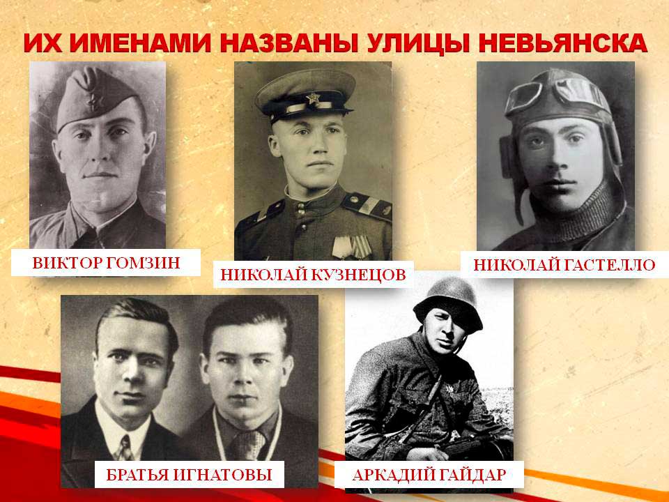![]() В 2026 году - 325 лет со дня основания г.Невьянска. В городе насчитывается около 150 улиц, и каждая носит свое имя, у каждой своя судьба, свое рождение. Часто бывает, что прогуливаясь по улицам, даже не знаешь, кем и какими были люди, в честь которых названы те или иные улицы Невьянска. В советское время 5 улиц и переулков были названы или переименованы в честь участников Великой Отечественной войны, погибших за Родину. В феврале 3 классы школ г.Невьянска на часе мужества «Их именами названы улицы» познакомились с биографией и подвигами участников Великой Отечественной войны и приняли участие в исторических играх. Улицы расположены в частном секторе – это улица братьев Игнатовых и улица Гомзина, переулок Кузнецова, переулок Гастелло и переулок Гайдара. Названия улиц помогают сохранить память о подвигах участников в годы войны. | |